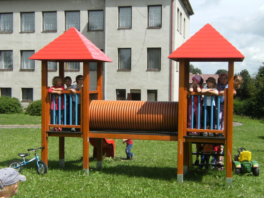 Velká zahrada, přehledná s třemi pískovišti, tělovýchovným nářadím, dostatečným množstvím sezení a koutků pro hry dětí, se skladem pro hračky pro pobyt venku a sociálním zařízením. Pravidelná péče o zahradu, sečení trávy, střih stromů a keřů a péče o růže zajišťuje pěkně upravené prostředí, které přispívá k pohybovému vyžití dětí s možností využití k nejrůznějším hrám, k pracovnímu zapojení dětí a k dalším aktivitám i k odpočinku.